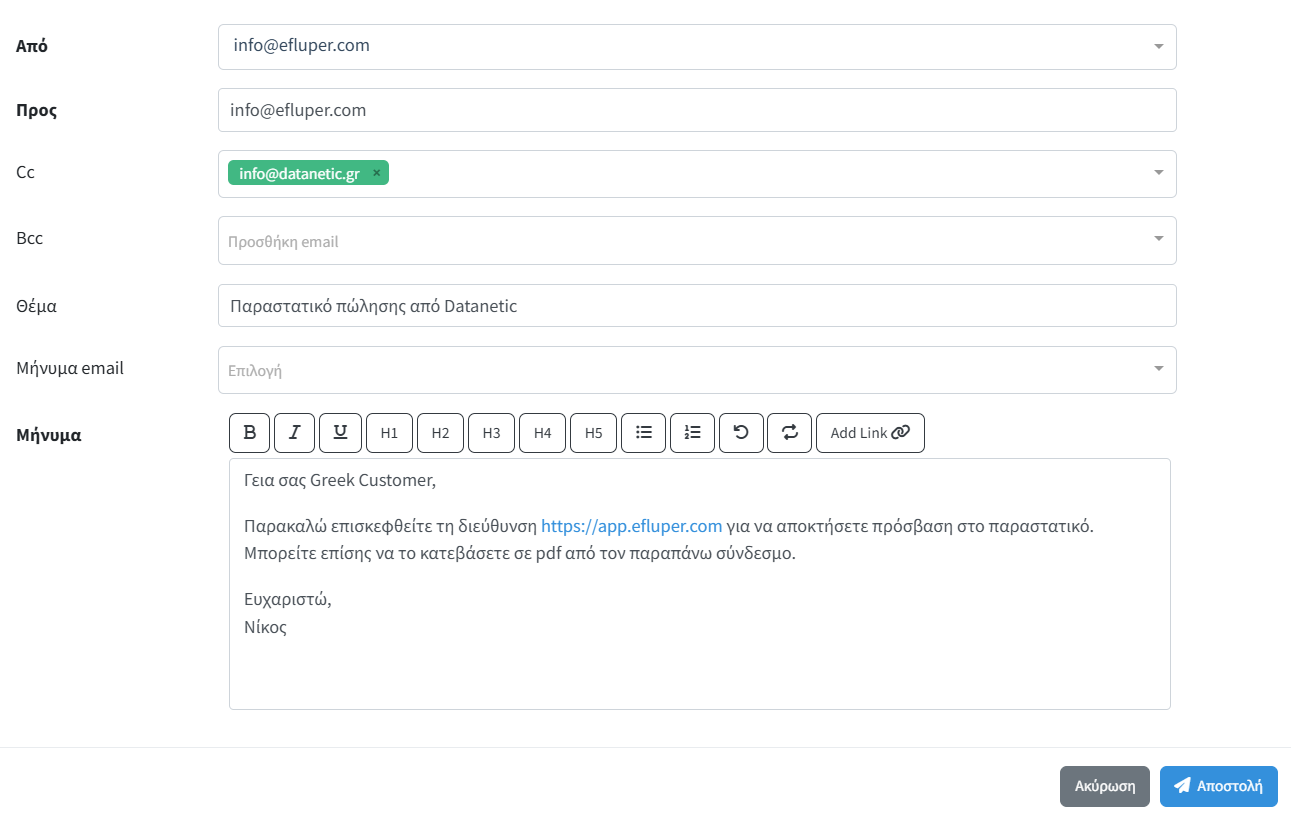 Με ένα click μπορείς να στείλεις το παραστατικό στον πελάτη ή προμηθευτή σε μορφή PDF.